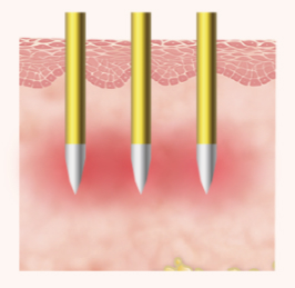 Nach einer gründlichen Reinigung mit 70%igem Isopropylalkohol wird das zu behandelnde Hautareal schachbrettartig mit dem 1cm2 großen, quadratischen Handstück abgearbeitet. Innerhalb von wenigen Millisekunden dringen 49 sehr feine Goldnadeln senkrecht 0,5-2,0 mm tief in die tieferen Hautschichten ein und erwärmen diese durch einen hochfrequenten Stromimpuls. Da die Nadeln bis auf ihre 0,3mm lange Spitze vollständig isoliert sind, und nur dort Strom abgeben, werden die oberen Hautschichten nahezu komplett verschont. Dies reduziert Schmerzen, Ausfallszeiten und Nebenwirkungen auf ein Minimum. Die Parameter Eindringtiefe, Energiedichte und Dauer des Impulses werden je nach Diagnose und Behandlungsareal variiert. Aus Hygiene- und Qualitätsgründen wird für jeden Patienten ein gesondertes Einmalhandstück verwendet, das nach Abschluss der Behandlung entsorgt wird.